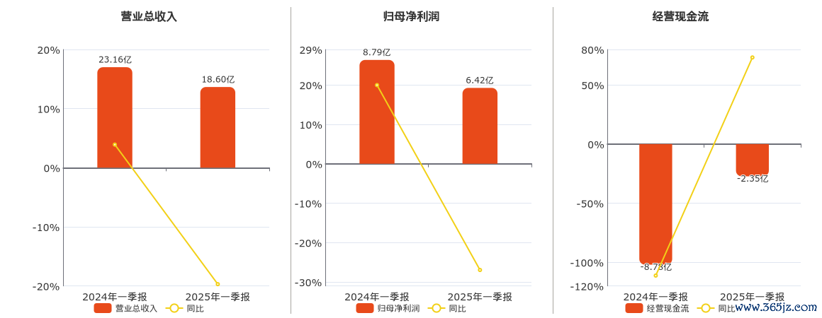 公司营业总收入为18.60亿元,较去年同报告期营业总收入减少4.56亿元,同比较去年同期下降19.70%。归母净利润为6.42亿元,较去年同报告期归母净利润减少2.37亿元,同比较去年同期下降26.95%。经营活动现金净流入为-2.35亿元。