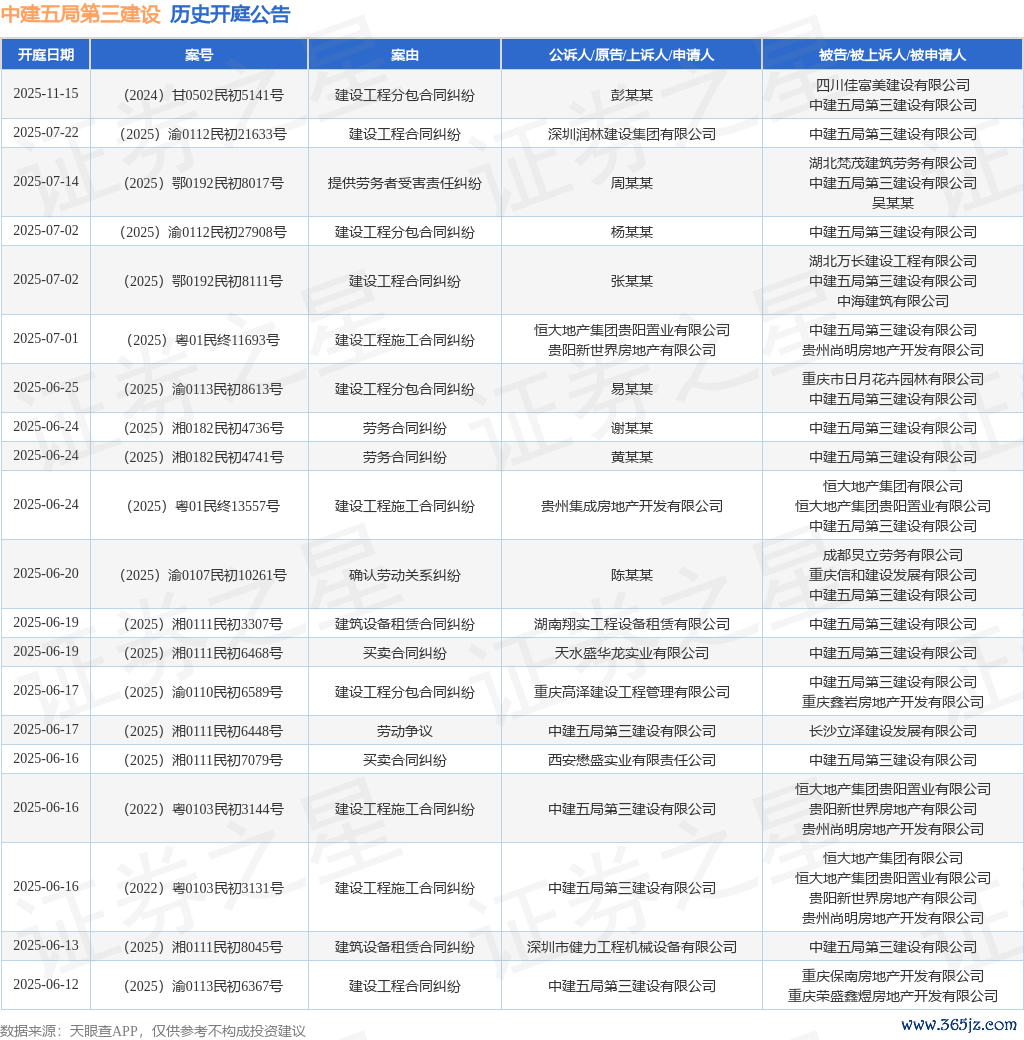 案号:(2025)湘0111民初3307号审理法院:长沙市雨花区人民法院案由:建筑设备租赁合同纠纷当事人信息: 原告/上诉人:湖南翔实工程设备租赁有限公司 被告/被上诉人:中建五局第三建设有限公司开庭日期:2025年6月19日根据统计,近一年内以中建五局第三建设有限公司为当事人的历史开庭公告有462则,其中案由为“建设工程施工合同纠纷”的公告以118则居首,其次为“买卖合同纠纷”有96则,“建设工程分包合同纠纷”有43则。历史开庭公告(前20条)如下: